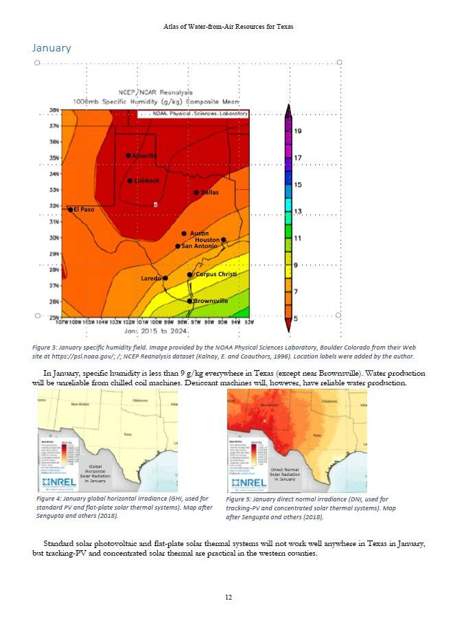 Contents include maps of monthly specific humidity fields, water-from-air performance analyses for 21 selected locations (comparing performance by month of chilled-coil AWGs and solid desiccant AWGs), 5 technical appendices, and a list of AWG suppliers in Texas. Order your eBook at the Atmoswater Shop.