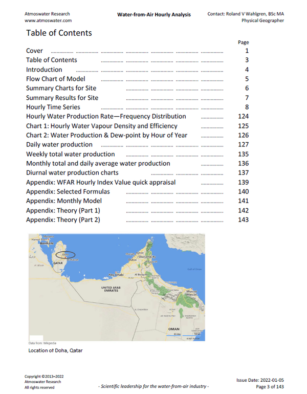 Doha, Qatar; Hourly data is from a Typical Meteorological Year representing recent conditions; 143 pages; PDF; Click the Table of Contents in the images to the left*. Explore other interesting pages by clicking on their images*. The analysis is for a generic 550 L/day mechanical dehumidifier type atmospheric water generator. If you have, say, a 275 L/day machine, multiply the water production rate values in the report by (275/550) = 0.5. Similarly, for a 1650 L/day machine, multiply by (1650/550) = 3.