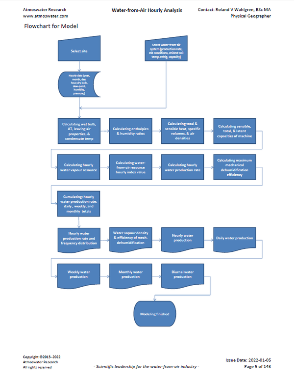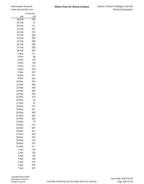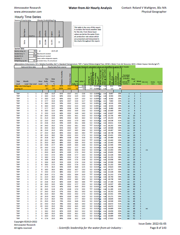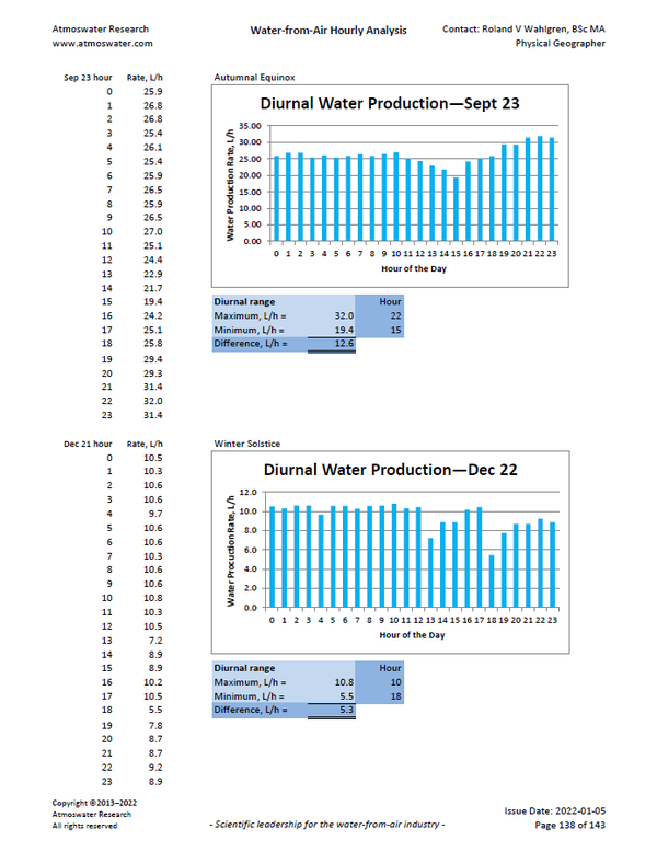 Hourly analysis reports are our premier knowledge products. The methods for generating the water-production results have been refined over many years. The water production results require about 8 hours of computer run-time on a Core i7 8th generation PC. The reports allow a deep understanding of the performance at a site of a mechanical dehumidifier type atmospheric water generator. Quality control is built into the analysis by comparing the monthly water production values resulting from two independent computer models (see the excerpt from page 141 of the page images at left*).
