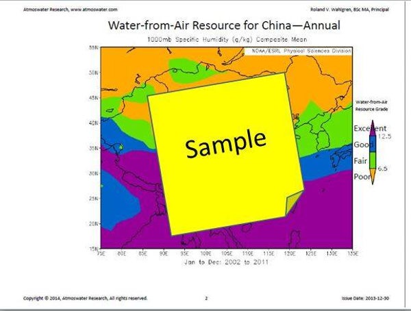 - Cover page with sections titled 'About the maps' and 'References' plus one annual map and twelve monthly maps for a total of fourteen pages. The resource grading system is by Atmoswater Research and is guided by data from the USA's National Oceanic and Atmospheric Administration. The atlas captures the complex geographic and seasonal variability of the water-from-air resource in China. Use in conjunction with the Water-from-Air Resource charts for selected cities in China and when necessary, hourly analyses.