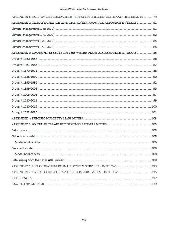 Contents include maps of monthly specific humidity fields, water-from-air performance analyses for 21 selected locations (comparing performance by month of chilled-coil AWGs and solid desiccant AWGs), 5 technical appendices, and a list of AWG suppliers in Texas.